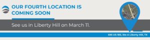 Find us conveniently located attached to the new Liberty Hill Costco just off US-183. Feel free to park anywhere in the Costco parking lot.